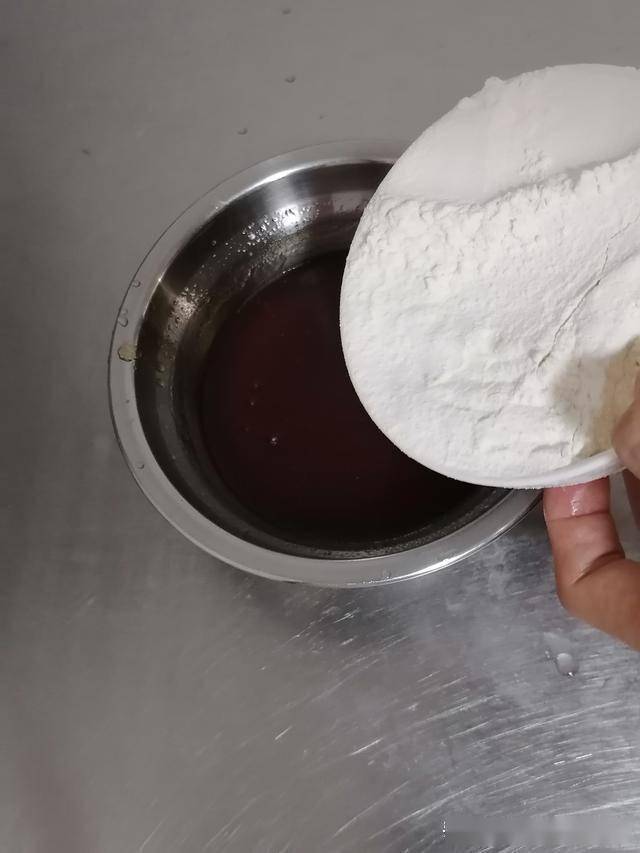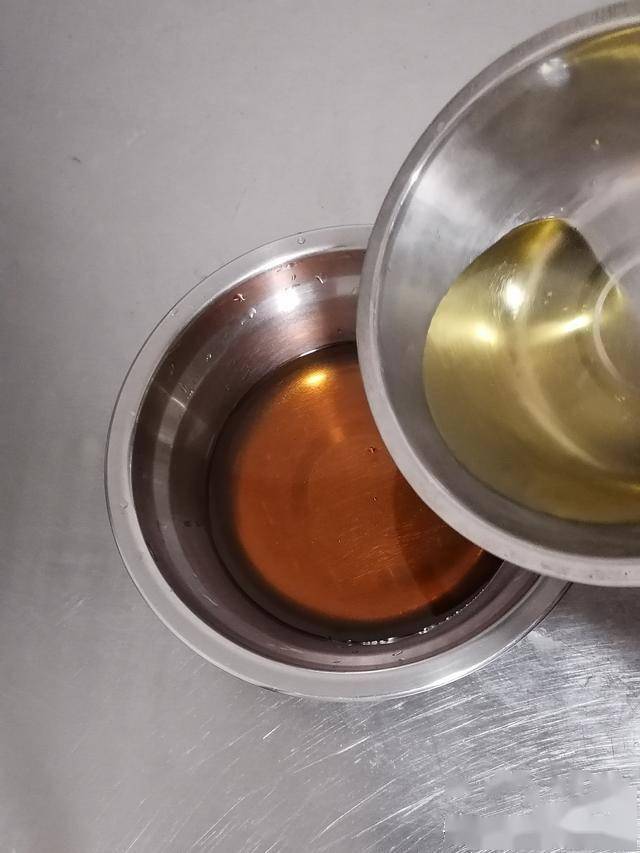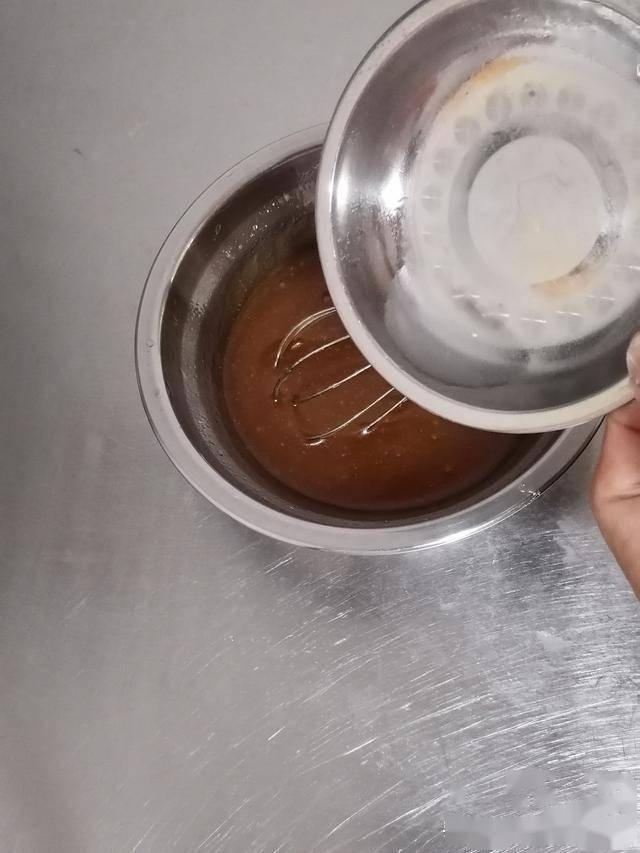 一、糖浆250克倒入玉米油85克,边倒边搅拌