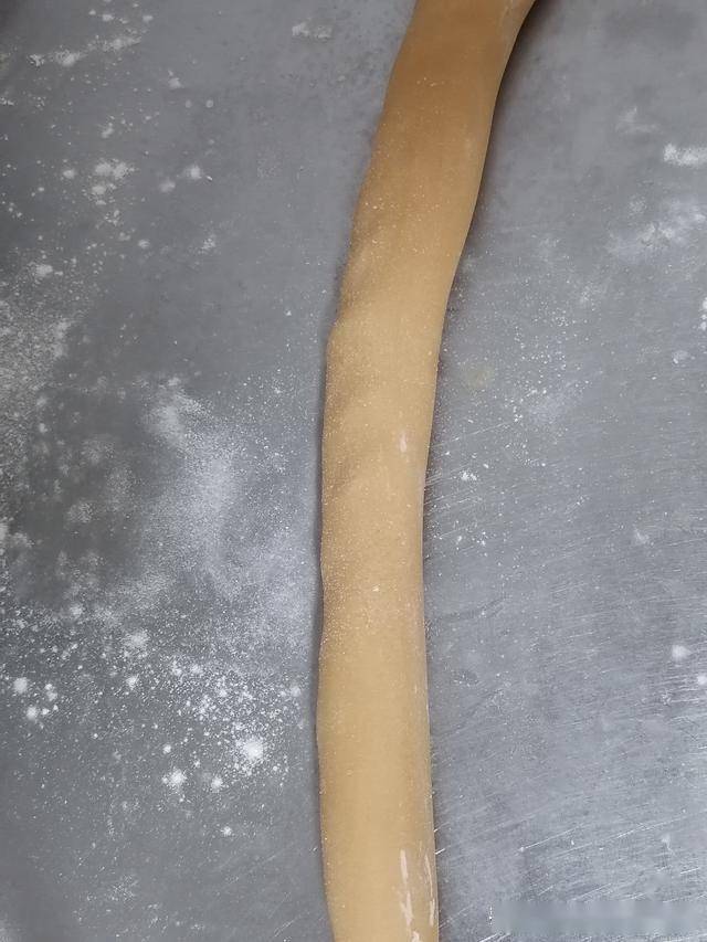 五、面粉上撒上少许熟面粉,和好的面团搓成长条