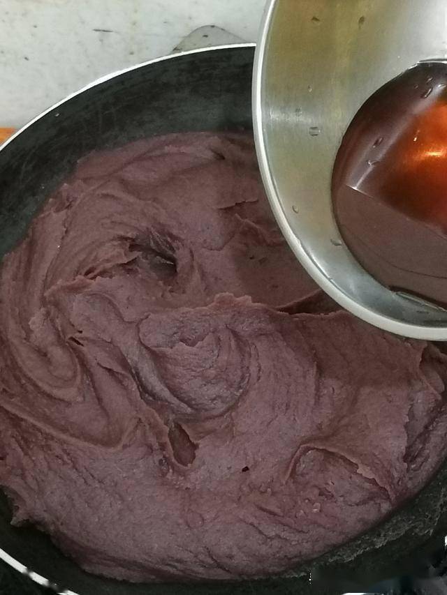 六、打好的豆沙泥放入锅中,小火炒,倒入糖浆100克(用蜂蜜代替也可以)