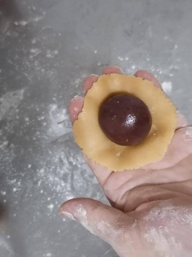 八、包上豆沙馅30克(豆沙搓成圆球,放入冰箱冷冻1小时,这样容易包)