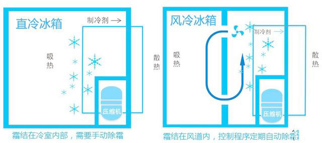 风冷:现在冰箱最常见制冷方式,速度快制冷均匀,不结冰,无辅助功能情况下,保鲜能力较差(技术在升级,现在风冷保湿保鲜效果也很不错了);